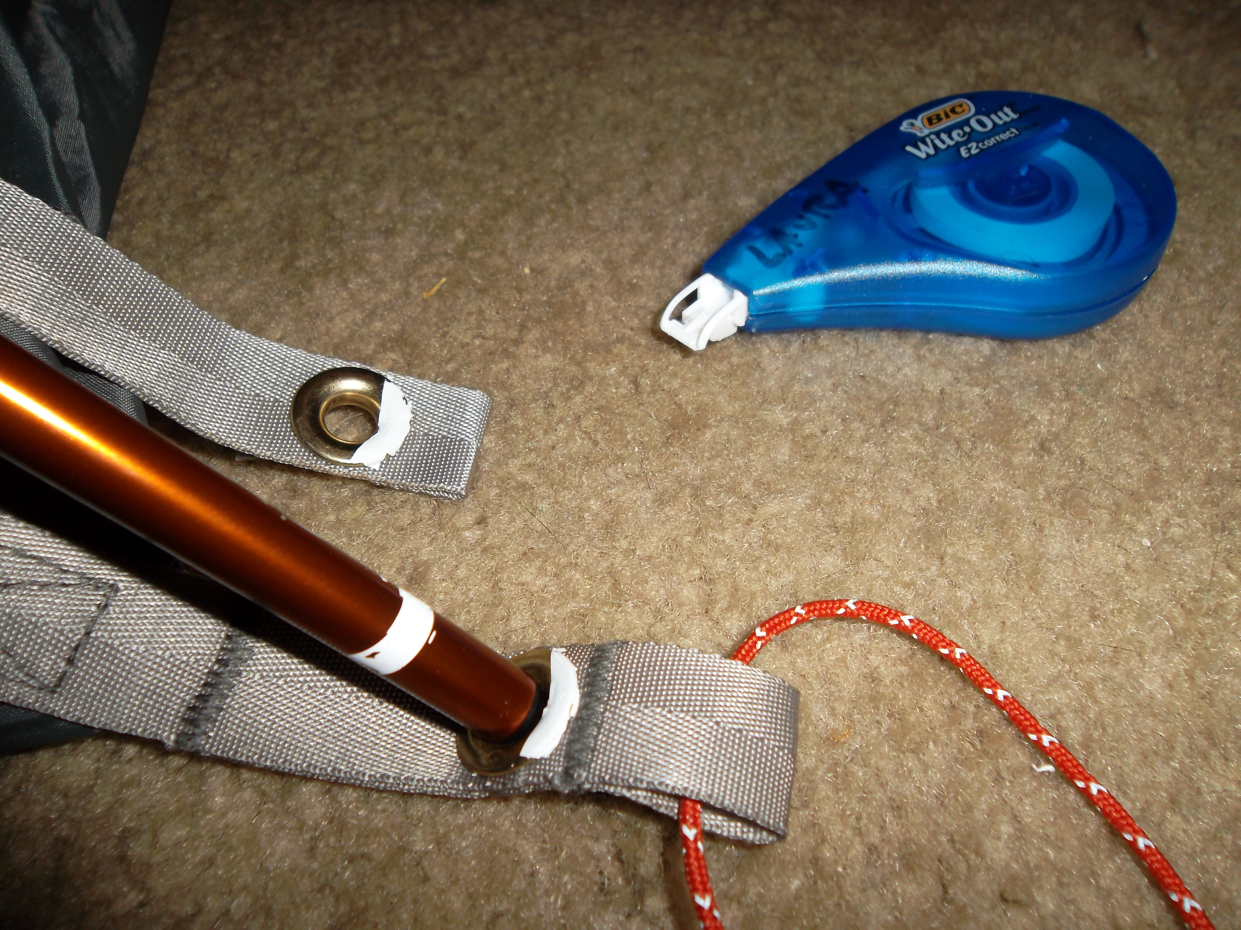 All you need to do, is paint one end of the tent with a small line, or even a dot. Make sure you match the pole, tent sleeve or grommet, footprint if applicable, and rain fly with the same color. Most tents only require a single color to be applied to one side. Some, more complicated tents may require 4 colors or more, one for each corner. You will have to analyze your tent to determine your needs. Just paint in on, and forget it. I go for the minimal approach, as you can see here. I recommend you only paint on the metal components, just in case the chemical you choose decides to react with the nylon.
