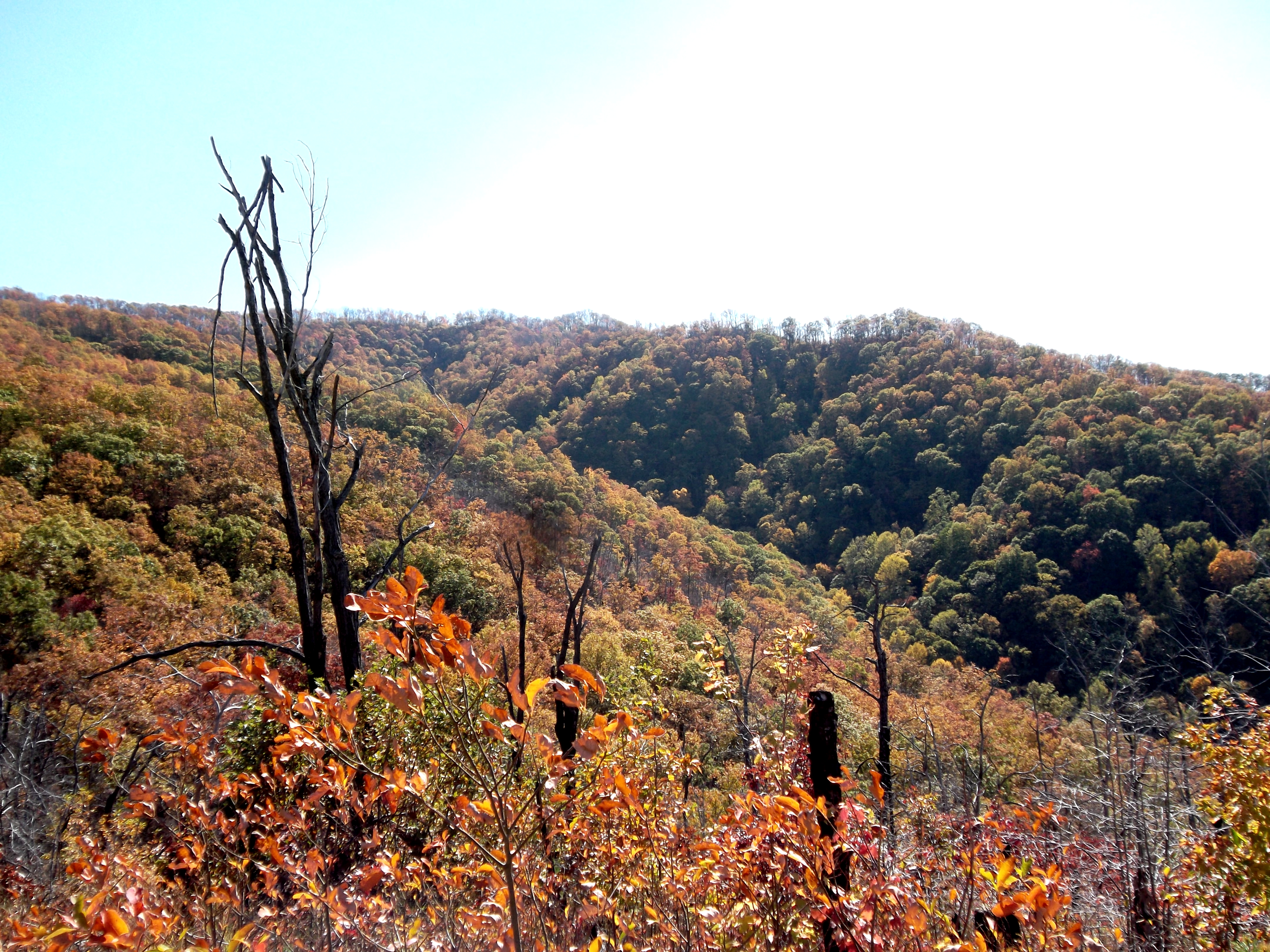 From here at the stream you can venture left onto the white trail, which climbs long and steep up the side of the mountain. Look closely or you will overlook the trail that slips inconspicuously into the woods just past the blue trial which heads straight up the mountain. You will cross an access road, but quick reconnect onto the trail a few yards up. Continue along, staying straight at the next intersection of trail. Eventually, you will arrive at the top of the mountain, and are rewarded with the view of Erwin Tennessee. Limestone hangs above and over the mountains ridge. This is called White Rock. Peering into the valley opens up a new view of the city few have had a chance to enjoy. Continue along the ridge, and eventually you will find another taller view of the city below, this is Chimney Top. Further along, you’ll eventually pass a small connecting trial that accesses the radio tower hidden on one of the peaks. Continue straight.
