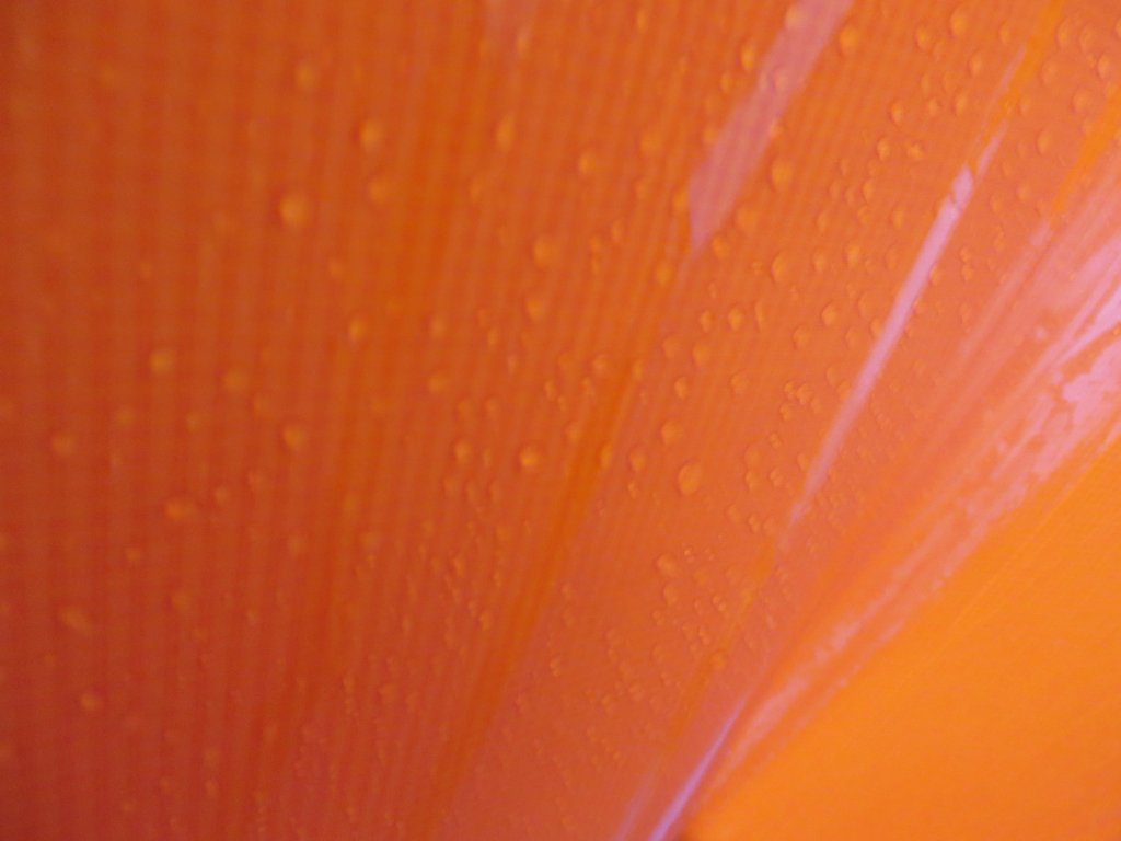 The tent is comprised of a 50d polyester treveria for the tent canopy (the orange sections) and a 68d polyester rip-stop.