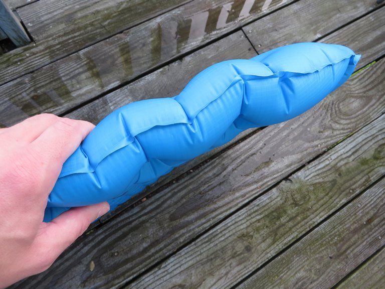 The pad packs up very small, at round 3.5″ x 6.5″. Packing up is very easy, thanks again to the quick deflate valve. There’s no squeezing the air out to make it fit inside the stuff sack. A first for me.