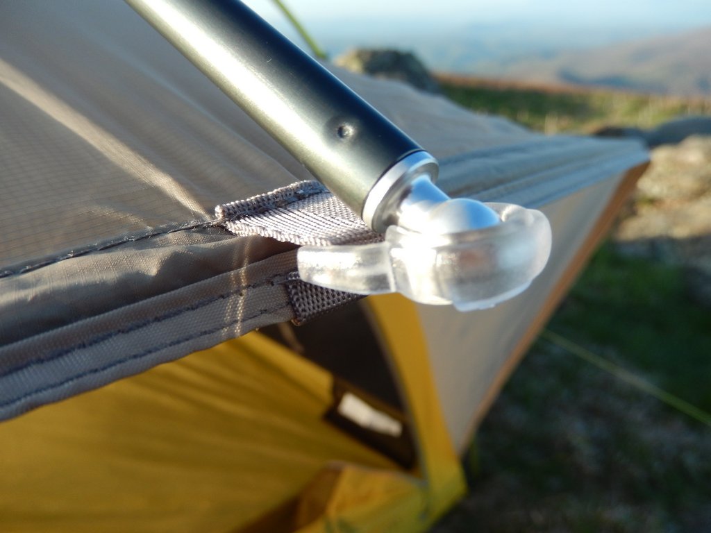Moving gear storage to the sides of the tent is a hugely understated feature of this tent. It gets all of your gear out of the way of entering and exiting, while also allowing quick access from the inside or outside of the tent. No more climbing over packs, or getting gear wet while opening the tent doors. The improved gear closets provide huge amounts of storage, and never once have I ever even had to stack gear up to make it all fit inside. I could sprawl out my equipment instead of piling it up in a heap. The internal zippers allow for quick access to anything you need. Sierra Designs Lightning 2 FL The above, combined with the vertical front door and vestibule provides the most convenient entry and exit of any tent on the market that I’ve tested. The awning furthermore provides an opportunity to unzip the protective layer of the door, exposing the breezy mesh for viewing during the rain, or increased ventilation. This is lovely while being trapped inside during a storm, as it eliminates that feeling of claustrophobia while pairing that age-old past time of watching the rain. I’ve never had rain get inside while leaving the waterproof door open, except perhaps in sideways blaring rain. Sierra Designs Lightning 2 FL Stability is impressive. Perched atop a completely exposed 6000 foot peak, the harsh winds of the East Coast rain season couldn’t budge it. 4 guy out lines connect to the four corners, while the simple one piece body/rain fly connect to the pole and provide a surprisingly robust frame. Rocking winds left the tent undisturbed, with minimal movement, and one of the quietest sleeps I’ve ever had in a tent. No flapping, moaning, or buffeting here thanks to the taut pitch and sturdy build. It’s a light sleepers dream. Sierra Designs Lightning 2 FL hub system Ventilation is great, with ample opportunity for air flow through the large vent at the foot, wide open vestibules on the sides, and the gaping mesh screen door on the front. A breeze can flow through the tent nearly unobstructed in positioned correctly, or blocked by turning the tent sideways and sealing up the front door. This can either minimize condensation, or maximize protection from the wind. Livability is nice, with plenty of room inside for two users to sit up (closely) without rubbing the head of the tent. Food space is adequate, and elbow room is plentiful enough to avoid each other, most of the time. Sierra Designs Lightning 2 FL Durability is great, with a tough floor that doesn’t require a footprint or careful tent selection, a rigid pole system, and a highly resistant tent fly. It’s a tent that can be trusted, and relied on. Pack weight and size is especially impressive, barely tipping the scales and taking up minimal pack space. Pitching the tent is as easy as possible. Lay down the tent, apply the poles and stakes and you’re done. No tent body and separate body to deal with. Sierra Designs Lightning 2 FL What I didn’t like