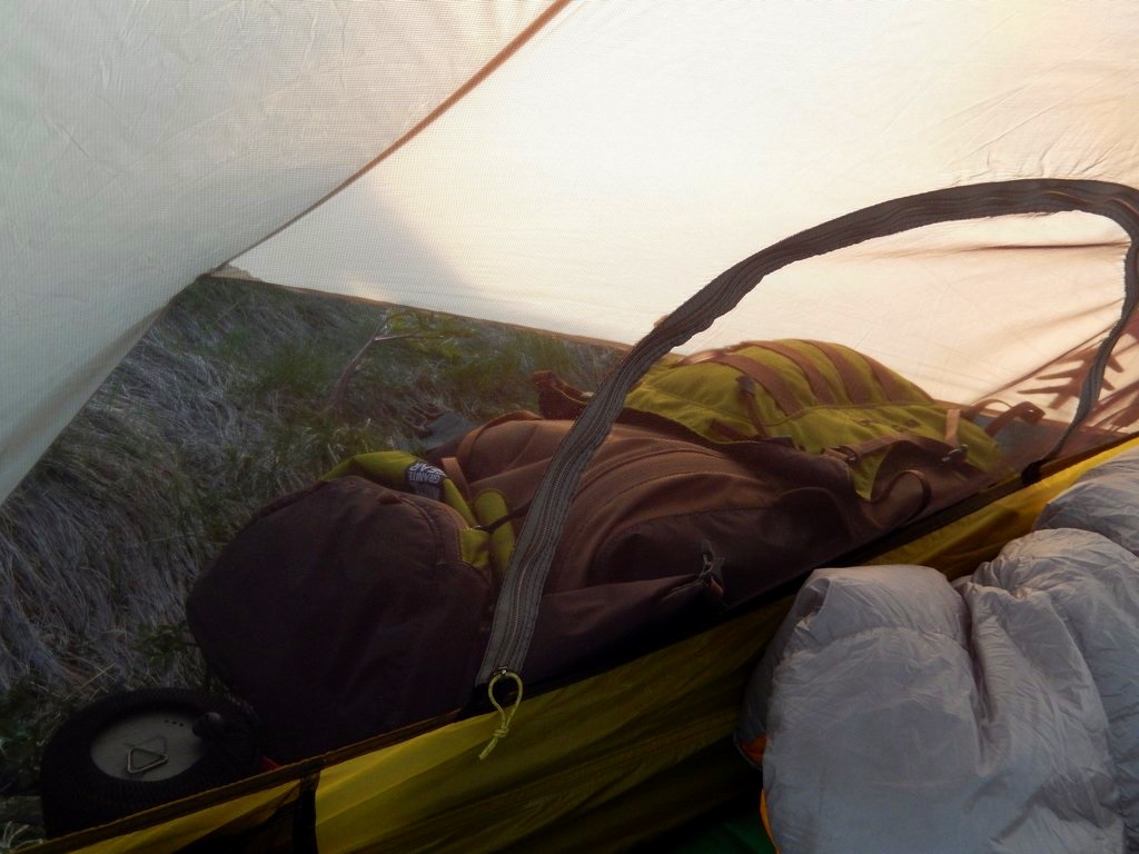 The lower end of the tent is a single wall, which cuts weight and reduced pack size. The downside to this is condensation will build up (as with any tent) and needs to be managed internally with a pack towel. I’ve never had it rain inside the tent from falling droplets of moisture as with other tents I’ve tested, but the foot of the tent does leave an exposed single wall where users tend to slide against the wall, right at the foot of the sleeping bag (below image). This can cause the sleeping bag to draw in some of this moisture. At it’s worst, it’s only been an inconvenience, but it is notable. I would like to see this issue eliminated in future designs. I’m being harsher here than on the last years model, as it’s still an issue that hasn’t been corrected. I’ve had no issues when using the tent solo, as you’re not cramped for space at the foot. I’ve never had any issues around the head of the tent either. Sierra Designs Lightning 2 FL Organization is limited, with two small pockets situated near the head that basically lay your equipment on the floor of the tent. Linear accessory attachment points inside can make for tricky hanging of damp socks, camp towels, and camp accessories. It’s a single linear trail of connection points. It works, but it’s not ideal. I would like to see the protective wall on the front door unzip just a little bit further down, allowing viewing of the outside while laying down if desired. Sierra Designs Lightning 2 FL Interior Overall