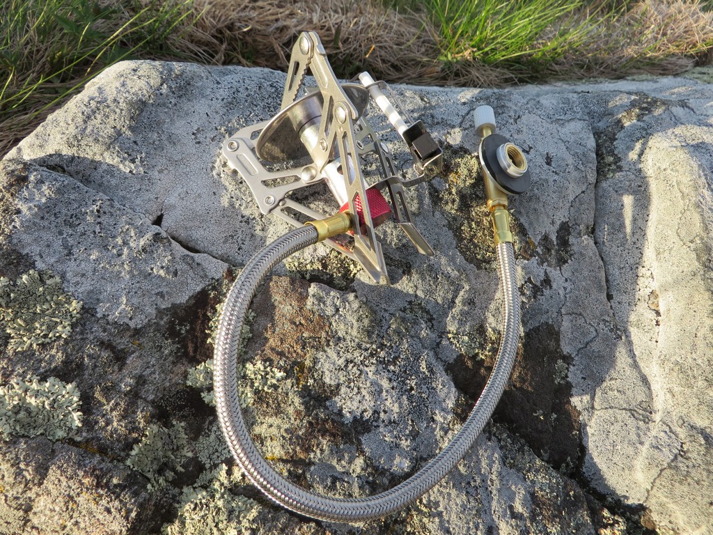 The Dpower Ultralight stove is 4.8 ounces of folding aluminum and steel. 3 collapsible steel legs and arms support your cooking pot while a long tube system moves your standard fuel canister away from the stove itself, allowing you to use a windscreen (or a pile of rocks) to protect the flame from gusts while cooking. An included Piezoelectric starter allows for easy lighting of the stove. The stove retails for 23.99, available on Amazon.com, and includes a light weight travel sack