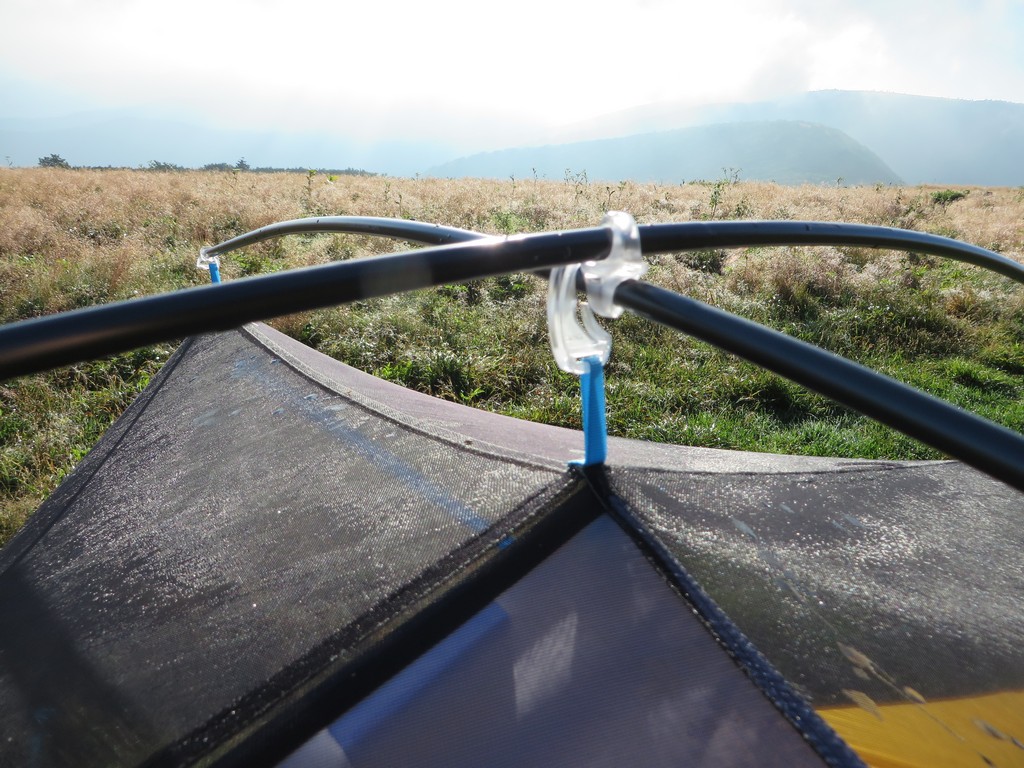 With great weight savings comes a few sacrifices. The most notable issue is that the corners that have no poles can sag under less than ideal pitching conditions. This creates a loose corner that can hang down onto the sleepers face or foot, which is a compounded issue if there is lots of humidity in the air, and thus condensation. Not only will the fabric touch the foot or head of the sleeper, these areas pick up condensation due to the pseudo single wall section, and creates a damp environment that can wet out a sleeping bag. A good pitch minimizes the issue, but we found ourselves stuffing gear into the corners to keep them out of the way when conditions were poor.