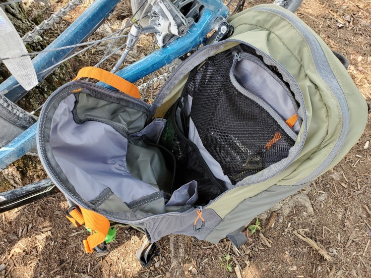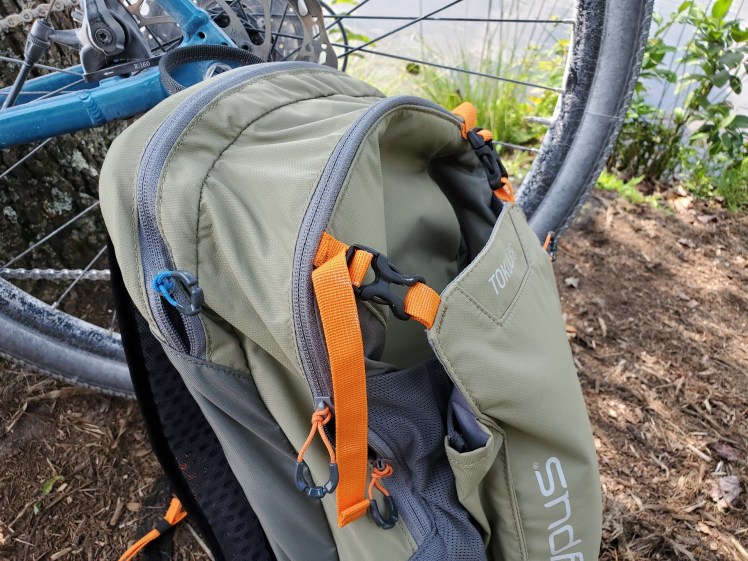 The most important aspect of any pack is comfort, so let’s start there. The Tokul XC, turns out, is a very comfortable pack. The shoulder straps are very lightly padded yet feel great against the collar bones thanks to their design, which is essentially compressible and forming foam between layers of nylon and mesh. This allows the straps to bend and flex easily across the chest and shoulders, without creating pressure or hard edges. The waist straps are minimalist, basically just bands of nylon, yet provide enough plenty of support to keep the pack in place over rough, bouncy terrain. The back panel is my favorite aspect of the design. It’s comprised of thick compressible foam panels that sit underneath a taut mesh body. The mesh panel does most of the work, gently sitting against the back, while the foam pads are pushed forward if there is any weight or hard object in the pack pushing in. The pack sits directly against the back for improved stability and balance, but still provides enough airflow to keep fresh air flowing in, and sweating to a minimum. Even with a fully loaded pack and several liters of water, spread over 20+ mile rides across rough terrain in the summer heat, I’m yet to experience any chaffing, soreness, or overheating.