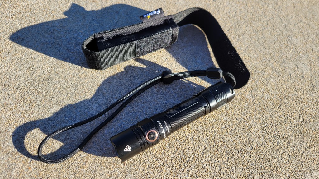 Starting with the overview, the PD35 is a high powered, 1700 lumen flashlight that includes a rechargeable battery with a 1.4-230 hour charge, depending on the mode selected. It includes an adjustable fabric lanyard, a rotating steel belt clip, and durable synthetic holster/carry sleeve. It is built from an aluminum body with a IP68 waterproof rating (good for a 6 foot deep bath for 30 minutes), retails for $80 and weighs about 3 ounces.