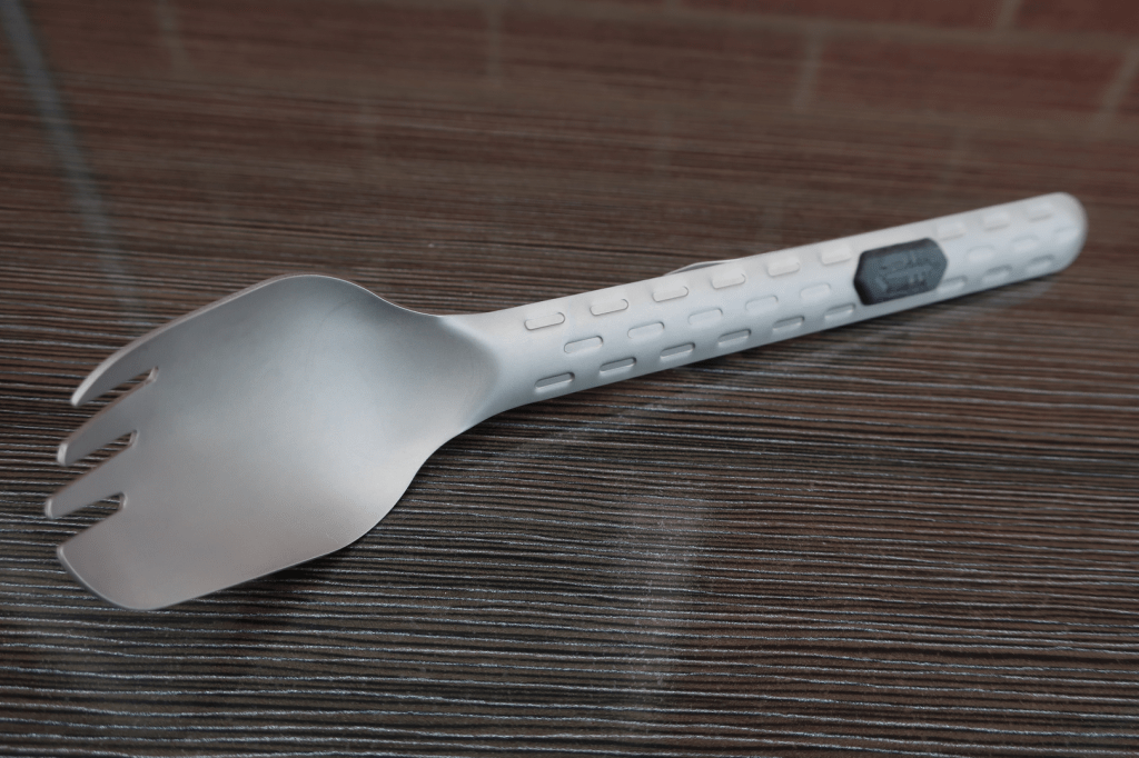 The Devour is completely built from titanium, except for a rubber joining mechanism in the center that combines the spork with the smaller multi-tool. Aside from the obvious spork, the other functions include a pry bar, package opener, can opener, and a large and small flathead screwdriver tip.