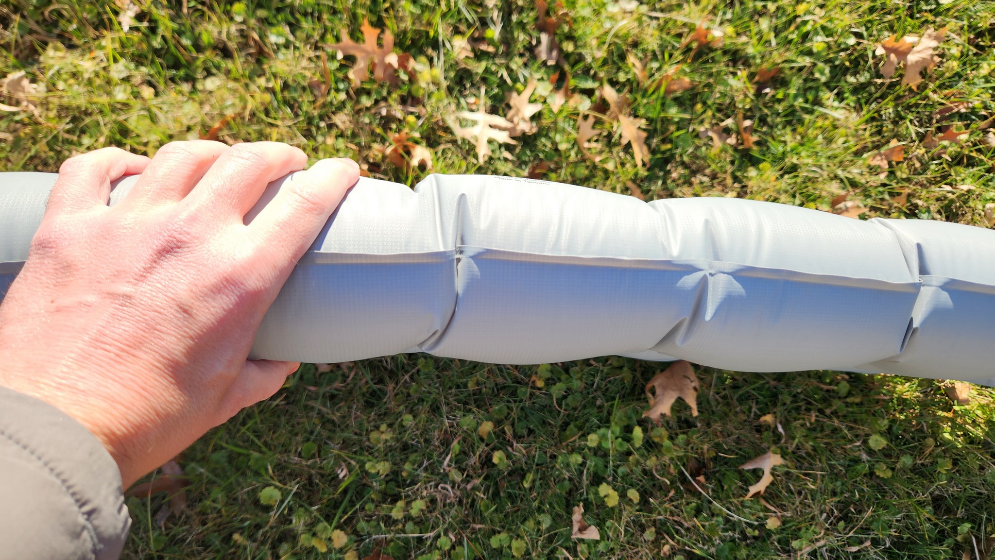 The warmth of the pad is good, and I can recommend this down to about 40 degrees F (about 4.5 degrees C). The insulation is a synthetic hollow fiber that’s attached inside and does a solid job of providing warmth across the surface. However, the large baffles do create slightly cooler zones than the rest of the pad, which can be noticed when used below my recommended temperature. When it comes to warmer season use, it regulates fairly well. It isn’t so hot that summer use is out of the question, while cool Fall and Spring nights feel great, even when paired with a quilt.