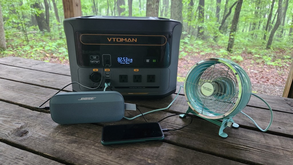 The Vtoman Flash Speed 1500 is a high capacity, portable power station with the ability to output 1500 watts, hence the name. It has an included 1548Wh batter, with an expansion bay and stackable design that allows it to double capacity to 3096Wh. The battery is the newer LiFePO4 technology, which is rated to last for over 3100 cycles. It sports 3 AC outputs, 4 USB A outputs, 2 USB C outputs, car ports for jumping batteries, DC outputs, and a quick charge AC input that can fully charge the unit in about an hour. It is solar panel compatible, weighs about 42 pounds, and retails for $1400.