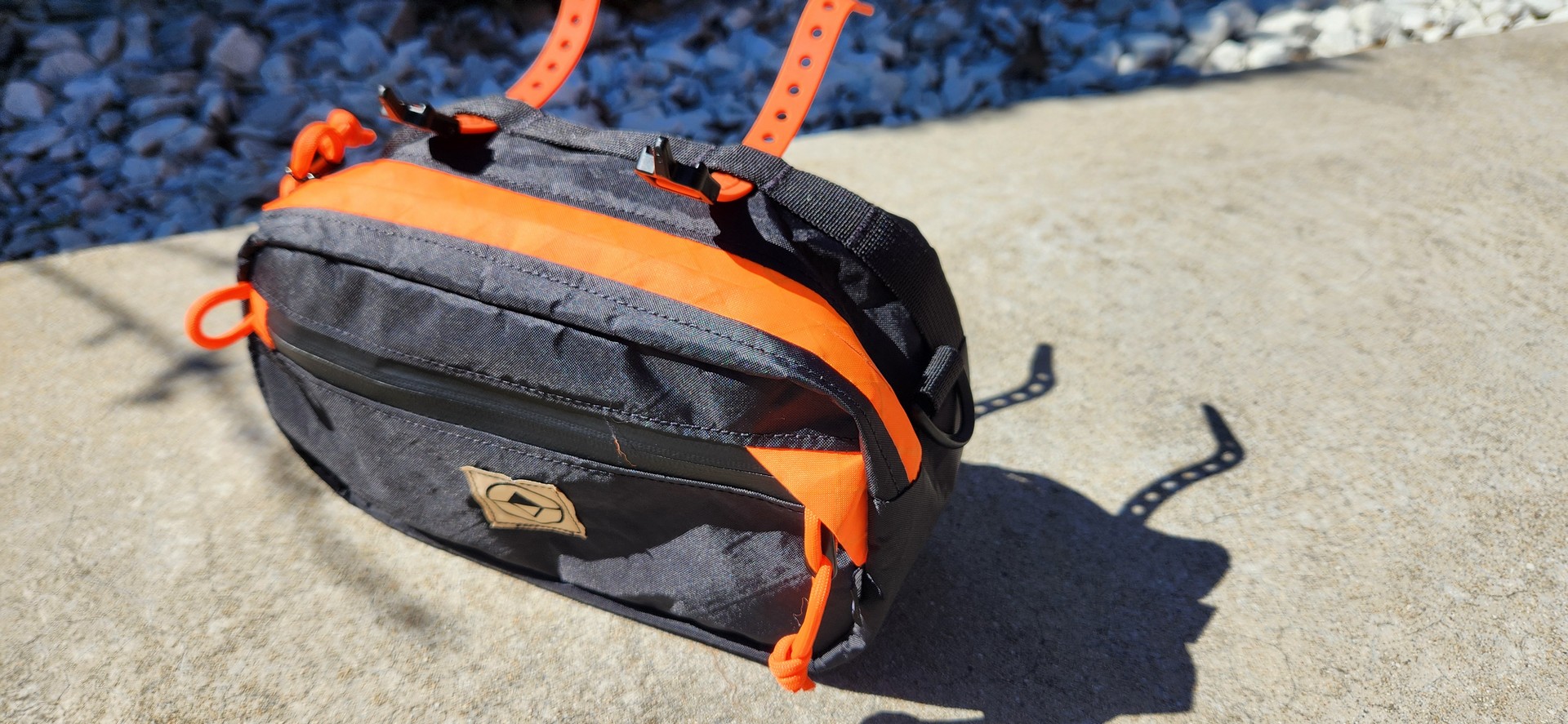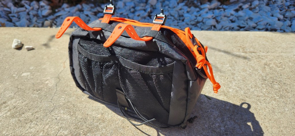Attaching the pack is quite simple. The straps are all included and allow the pack to be attached in a couple of ways, depending on the handlebar configuration of the bike and the preferences of the user. There are multiple lashing points on the pack itself, allowing for several attachment points for the straps. I found that using the center-most attachment points allows the pack to be mounted below the stem of the bike, while the outer-most attachment points pull the bag up higher. I opted to hang the bag lower as I had to dodge a mess of cables and mountain bike-like brake levers which protrude out quite far. Drop bar bikes seem to work better with the wider connection points, but either method will work fine. The bungee strap just slips around the handlebar and pulls the bottom of the pack in tight, which helps prevent it from flopping around and shifting side to side. This is technically optional but generally recommended. It’s been surprisingly secure with only some very minor shifting from side to side on rockier terrain,. The pack doesn’t handle jumps very well, which is expected. Thankfully, normal gravel riding, curbs, pavement, and even rocky sections have been no problem at all.