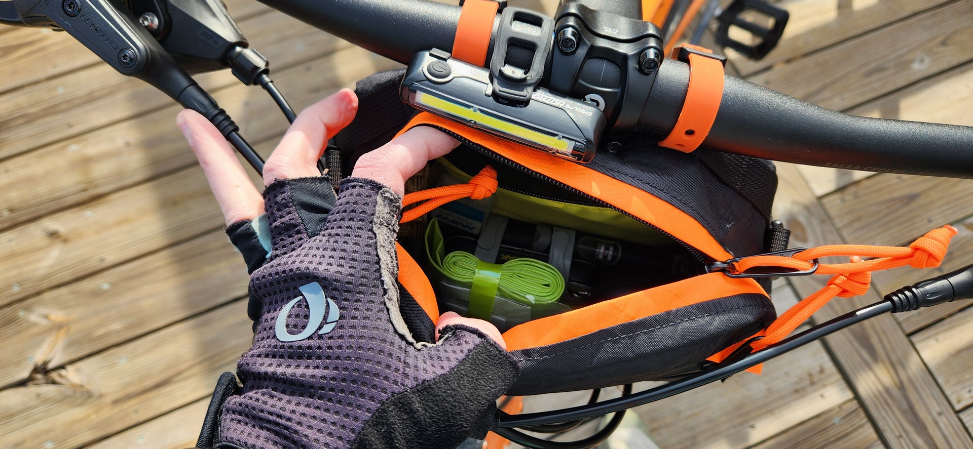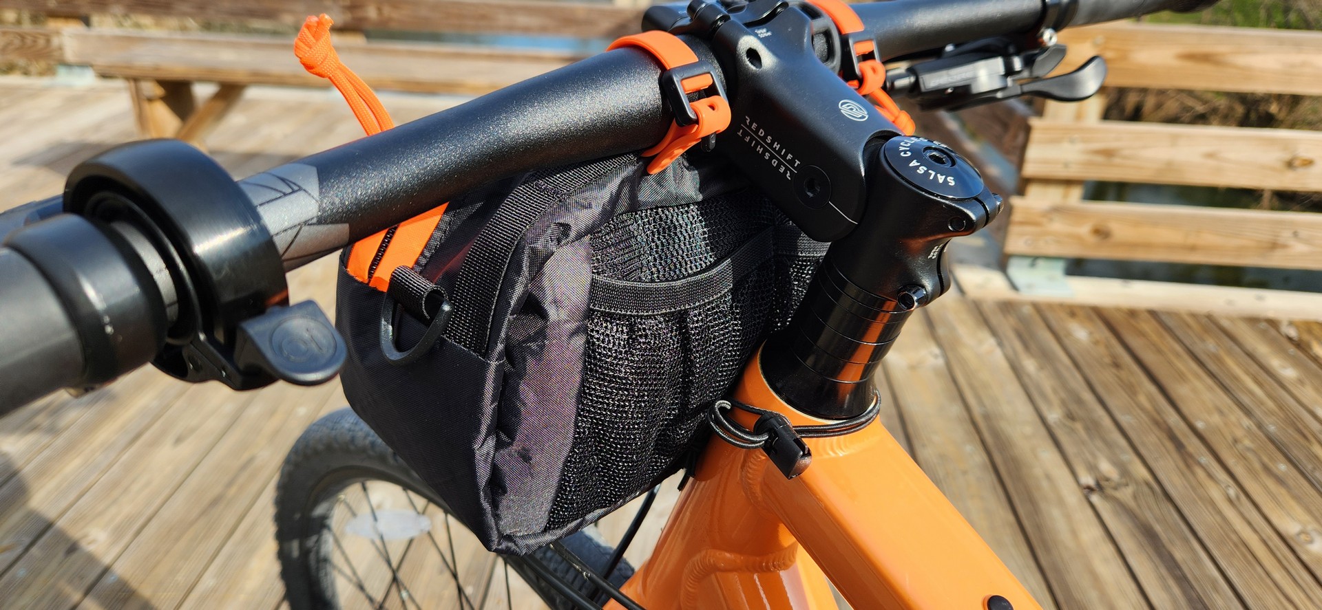 I’ve been rocking the Handlebar Pack for about a month now. Primarily I’ve been using it for bike commuting and longer gravel rides where I needed more equipment due to the rapidly swinging temperatures and weather in my area. There is nothing worse than leaving on a cold, frosty morning, only for the temperature to skyrocket with no way to shed a layer due to a lack of storage. This pack has given me a way out of that situation. Not only can it hold an extra lightweight layer (or two!), I’ve been able to stuff a bike pump, a change of gloves, a couple snacks, a multi-tool, and a spare tube, all inside without much fuss. It’s seriously impressive how much this small, out of the way pack can hold. For work days, alternatively, keys, wallet, lunch, and other accessories easily slide in the main compartment, with my phone generally going in the front pocket to prevent it from getting scratched up by my other tools. The two mesh pockets are located on the back of the pack. These are useful for snacks as they’re easily accessible while riding if need be, but I’ve also used it for IDs and other items that I may need to grab on the fly. The pack also includes a couple of Velcro strips that are located on the bottom of the inside which can be used for other North St. accessories, but I’ve not been down that road yet but will report back if I do.