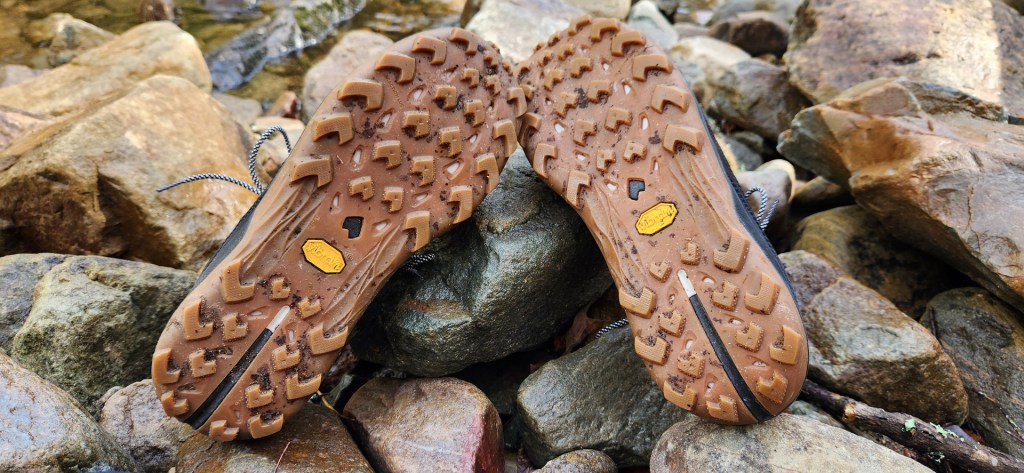 Trail stability is good. The Vibram outsole is really doing most of the work here. It is relatively thick and robust for a lightweight shoe, allowing it to hold form well in rougher conditions. It also allows it to flex well enough to stick to small wet roots, slimy rocks and mud without much issue. The tread patter is absolutely focused on forward movement with triangular, angular lugs pointing ahead at all times. This is when these shoes perform their best. As long as the wearer is pushing against the tread the acute angles are biting into to dirt and debris on the trail. The rubber is flexible and more than willing to provide excellent purchase is most conditions. The shoes can slide just a bit side to side in rare scenarios. Imagine stepping on a wet root with pressure laterally against the tread. Thankfully, this is a fairly rare scenario and hasn’t been a problem for me. Braking downhill is also surprisingly good, with the tips triangular lugs digging in quite readily on declines. The shoes do rock horizontally a bit despite the reinforced midsole, but so far hasn’t resulted in any stability issues for me. Given the flexibility and stretchiness of the upper this is expected.
