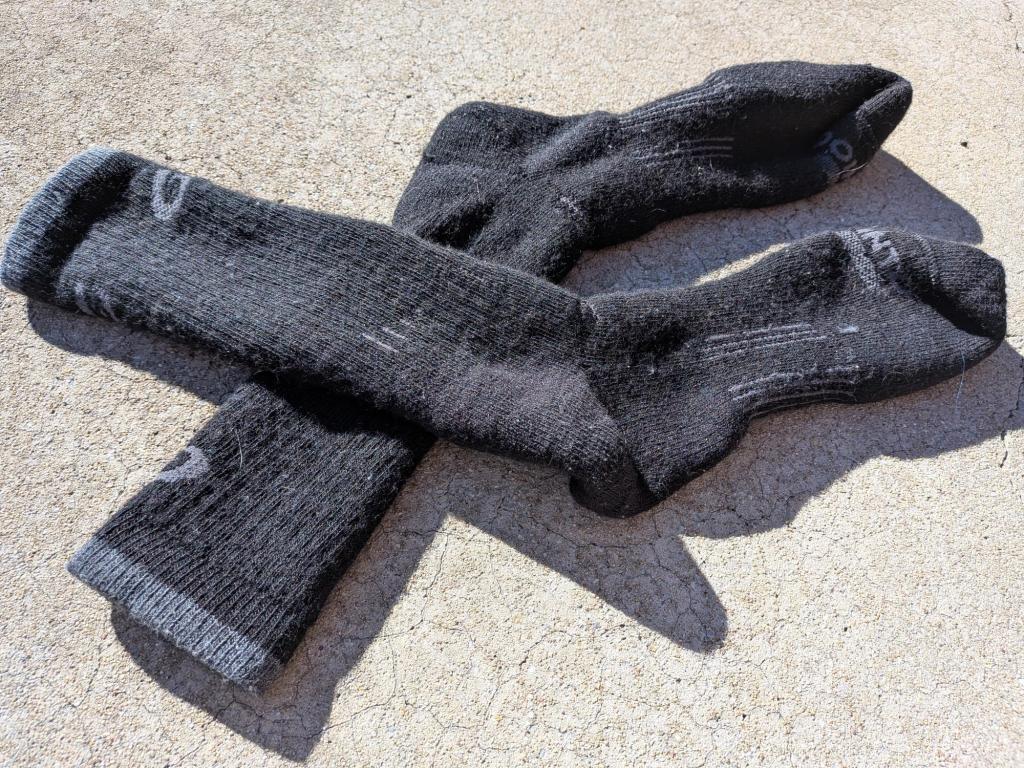 Next we have the “Extra Heavy” boot socks. These are essentially the heavy crew socks, just thicker and more cushy. Built from a similar but tweaked ratio of maters, they are Wool 77% | Nylon 20% | Elastic 3%. These feel great in heavy hiking or backpacking boots, and stay mighty warm in the winter, without being too hot for summer use either. I’ve put many miles down on these with heavy loads and stiff boots and they performed excellent. I didn’t experience any stretching, bunching, or blisters along the way. They’ve held up great to the friction of the boots rubbing against them and they wash up nicely without piling or shrinking. These are my personal choice for backpacking right now and I can’t recommend them enough.
