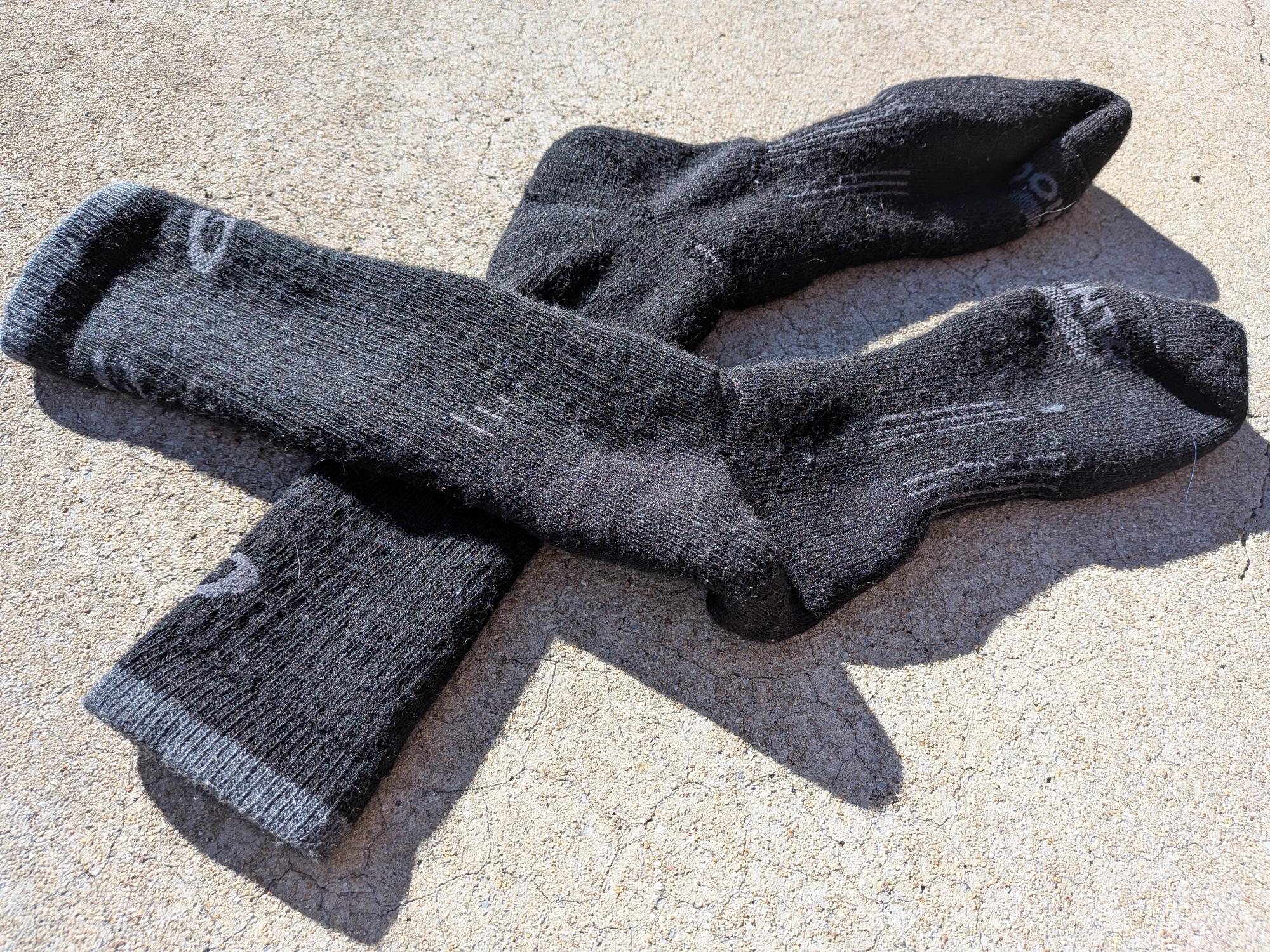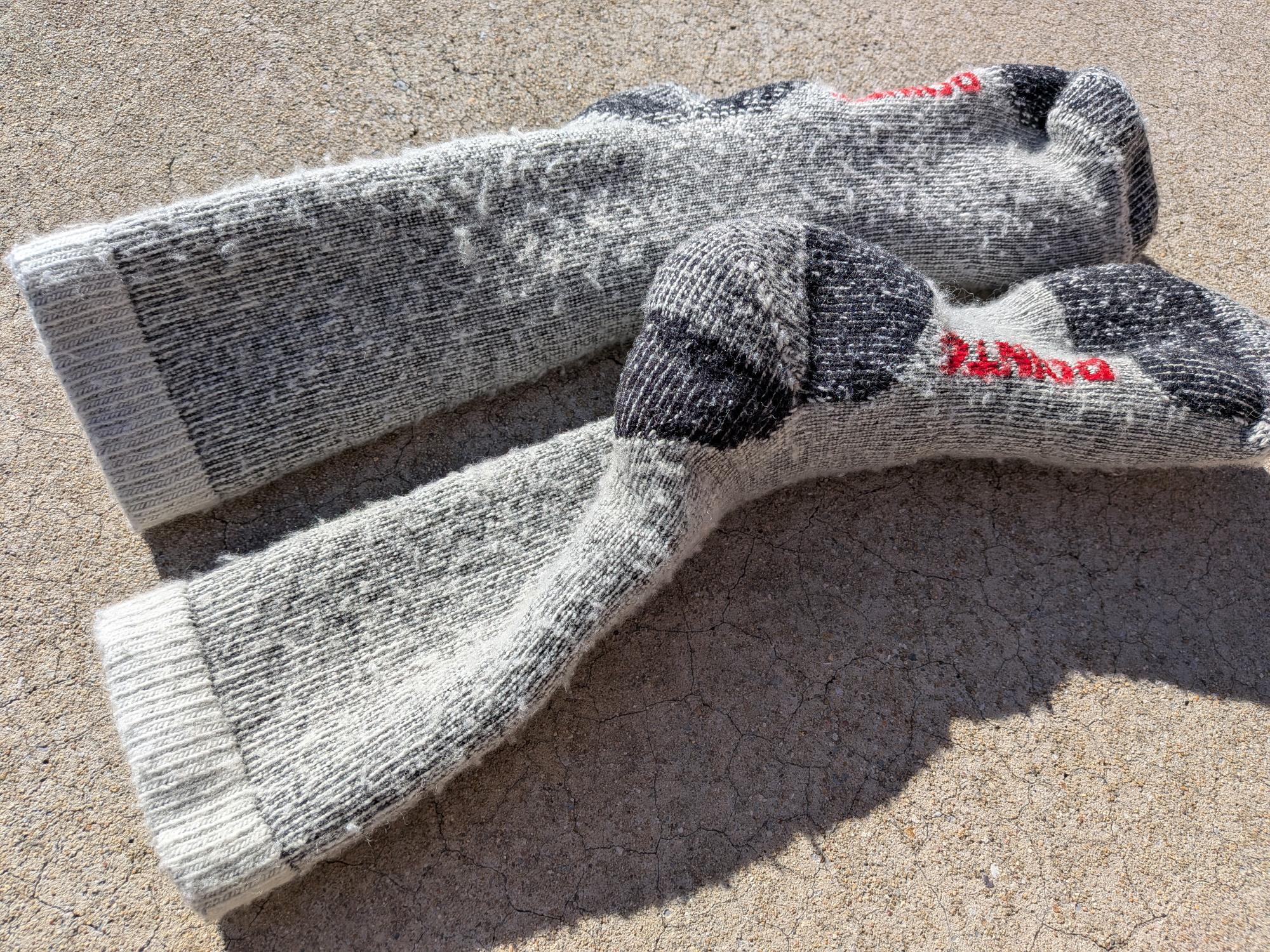 Next we have the “Extra Heavy” boot socks. These are essentially the heavy crew socks, just thicker and more cushy. Built from a similar but tweaked ratio of maters, they are Wool 77% | Nylon 20% | Elastic 3%. These feel great in heavy hiking or backpacking boots, and stay mighty warm in the winter, without being too hot for summer use either. I’ve put many miles down on these with heavy loads and stiff boots and they performed excellent. I didn’t experience any stretching, bunching, or blisters along the way. They’ve held up great to the friction of the boots rubbing against them and they wash up nicely without piling or shrinking. These are my personal choice for backpacking right now and I can’t recommend them enough.